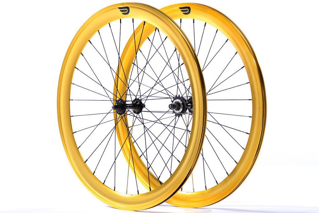 Pure Fix double-walled aluminum wheelsets are size 700C with a 50mm rim depth, front and rear. Our wheels include name-brand and laser-etched KT Quando hubs (100mm front, 120mm rear, 3/8" axle). Our rear wheels include flip-flop hubs with a pre-attached 16T fixed cog along with a 16T freewheel cog for single-speed riding. Our front and rear wheels are 32 spokes each. All wheelsets include nylon rim-strips to protect against sharp edges and prevent tube puncture.